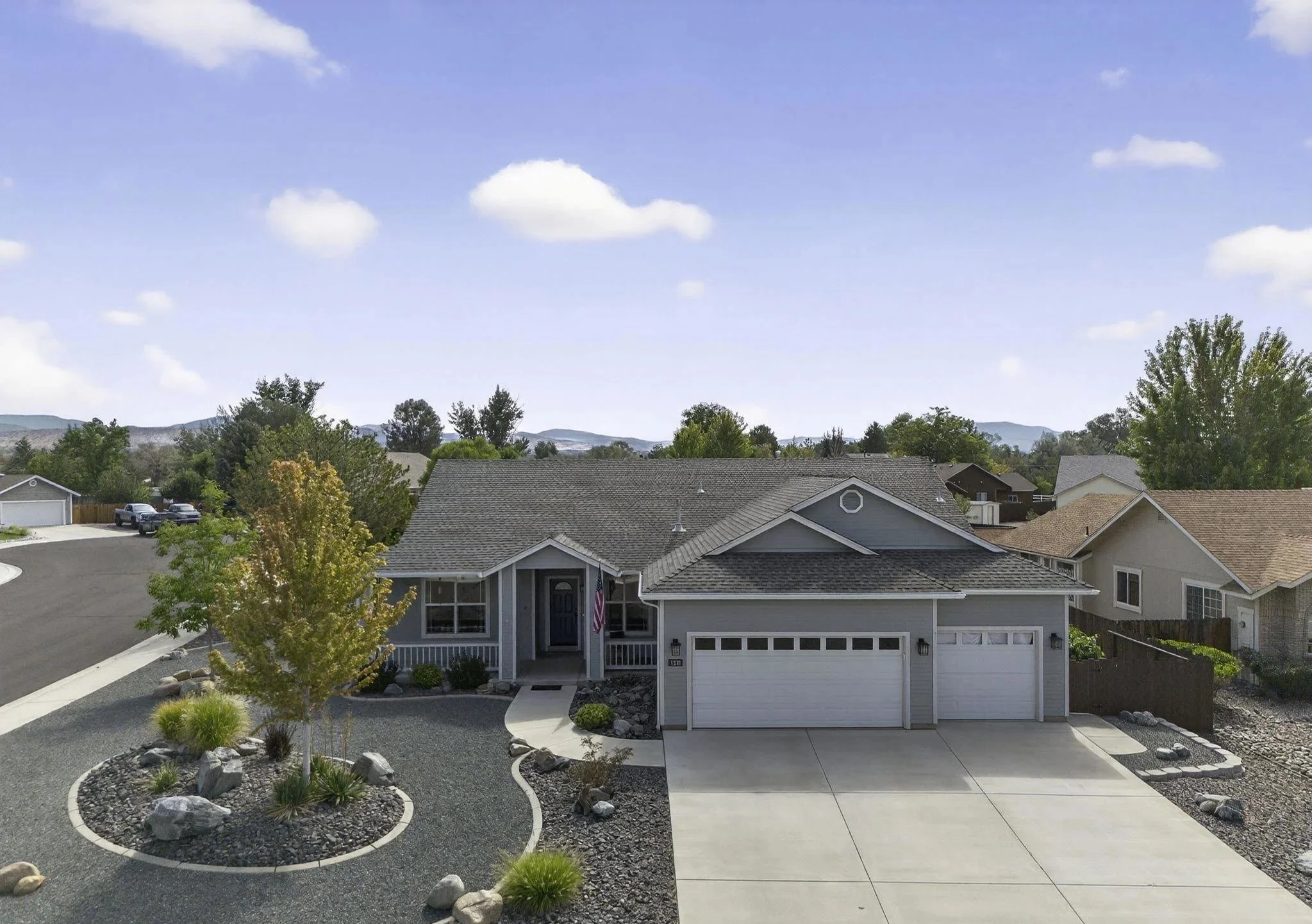 Welcome Home to Wildhorse in Minden! This beautifully maintained 1,848 sq. ft. 3bed/2bath 3 car garage home sits on a spacious .26-acre corner lot, offering both privacy and convenience in one of Minden's most sought-after neighborhoods. Thoughtfully landscaped with mature trees, low-maintenance yards, a covered and partially covered patio, storage shed, commercial-grade steel fire pit, and a 32.5' RV/boat/off-road toy pad (with room to extend), this property is designed for both everyday living and entertaining. Full drip system and lawn sprinklers complete the outdoor amenities. Inside, the home boasts a bright open split-floor plan. Large windows fill the living spaces with natural light, highlighting the pride of ownership throughout. Updates include commercial-grade luxury vinyl plank flooring, fresh paint, and striking LED light fixtures. The spacious primary suite features a walk-in closet and a spa-inspired bath with dual sinks and a custom two-person shower with rain glass door and infinity drain—truly a must-see. The kitchen is equally impressive, featuring newer KitchenAid appliances (2021)—double ovens, 5-burner gas cooktop, dishwasher, microwave, and refrigerator—along with a breakfast bar, dining nook, generous storage, and a custom pantry. Modern touches include Wi-Fi-controlled lighting and thermostat, Schlage smart front door lock, and Ring doorbell. With wide streets, sidewalks, parks, and trails nearby, plus quick access to outdoor recreation—20 minutes to world-class skiing, 25 minutes to Lake Tahoe, and 35 minutes to Reno—this home offers the best of Northern Nevada living.