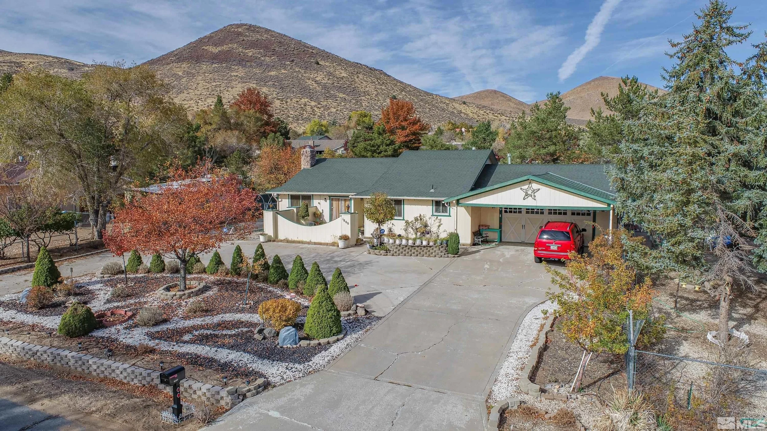 This fantastic 1-acre corner lot in a highly sought-after, quiet neighborhood in north Carson City. This single-level 3-bedroom, 2-bathroom home boasts a spacious 2-car garage and a south-facing wrap-around concrete driveway. Step inside to find a well-appointed kitchen with granite countertops, tile floors, and stainless steel dishwasher and refrigerator. The inviting living room features a cozy fireplace with views, perfect for relaxing evenings, and there’s a large laundry room., The spacious master bedroom includes a large walk-in closet and a private master bath with two additional sizable guest bedrooms and double sink guest bathroom. The property’s exterior features full fencing, a gated entrance to RV parking. A large carport sits in front of the garage, providing ample covered parking. Enjoy outdoor living in the beautifully landscaped yard, complete with over 40 fruit trees, including apples, pears, apricots, cherries, peaches, and plums, along with mature pine trees, rose bushes, and a charming gazebo. Two storage sheds offer plenty of space for tools and equipment, while the covered back patio and front courtyard provides the perfect setting for outdoor gatherings. This unique property combines comfortable living with abundant outdoor amenities and is located very close to shopping/dinning, medical facilities, 580 freeway, 7 min to downtown Carson City, 30 mins to Lake Tahoe, 30 min to Skiing and 25 min to the Reno Airport.